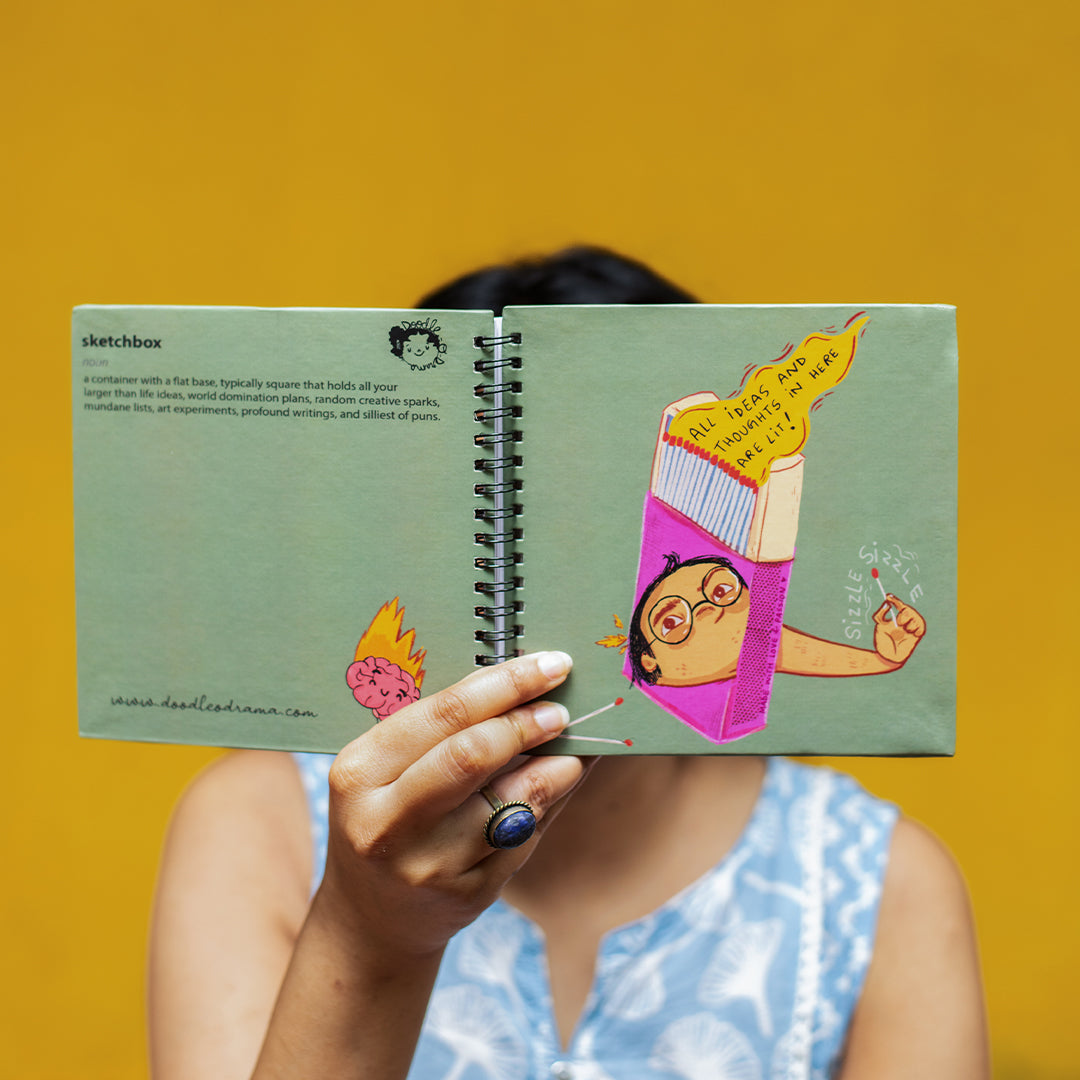 Why 'Sketchbox' : Glad you asked (even if you didn't!) After circle, square is my favourite shape and I decided to make all kinds of fun boxes; matchbox, sardine box, post box, watercolour box on these cute little square sketchbooks- a box on box (?) hence : sketchbox (tada!). You're probably not half as thrilled as I am with this play on words but I can assure you, that you'll still love these adorable, oh-so-vibrant books!